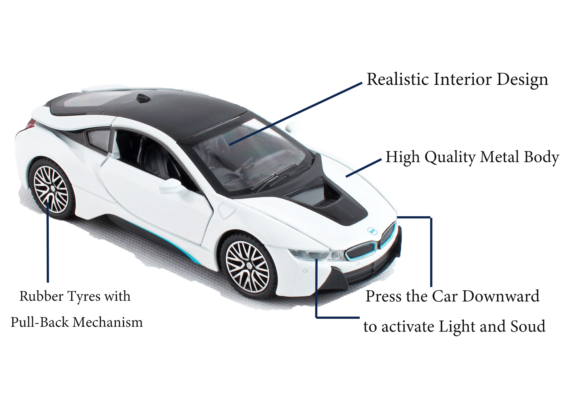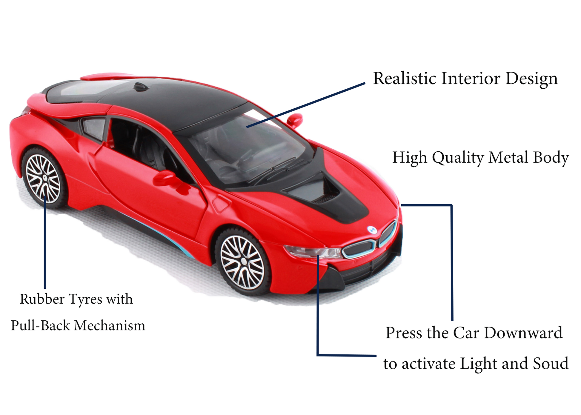 BMW I8 1:32 Scale Alloy Metal Pullback Toy car with Openable Doors Light Music