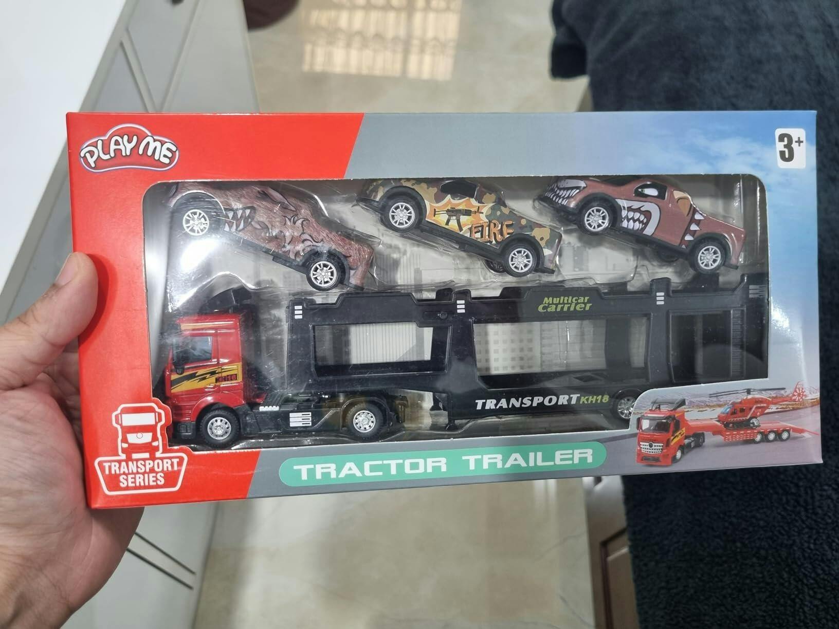 Die-Cast Transport Series Tractor Trailer Toy with 3 Cars & Pull-Back Action