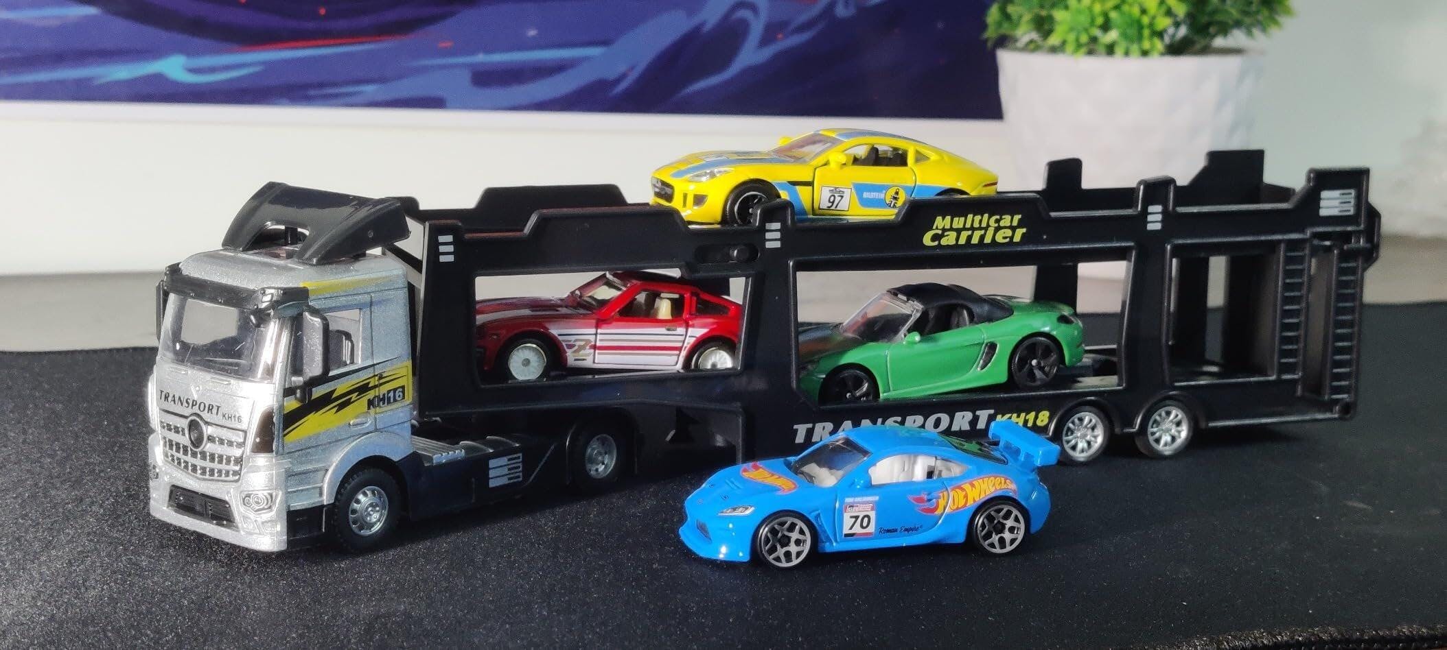 3 Cars Included: Comes with three colorful die-cast cars that can be loaded onto the trailer for realistic transport play.