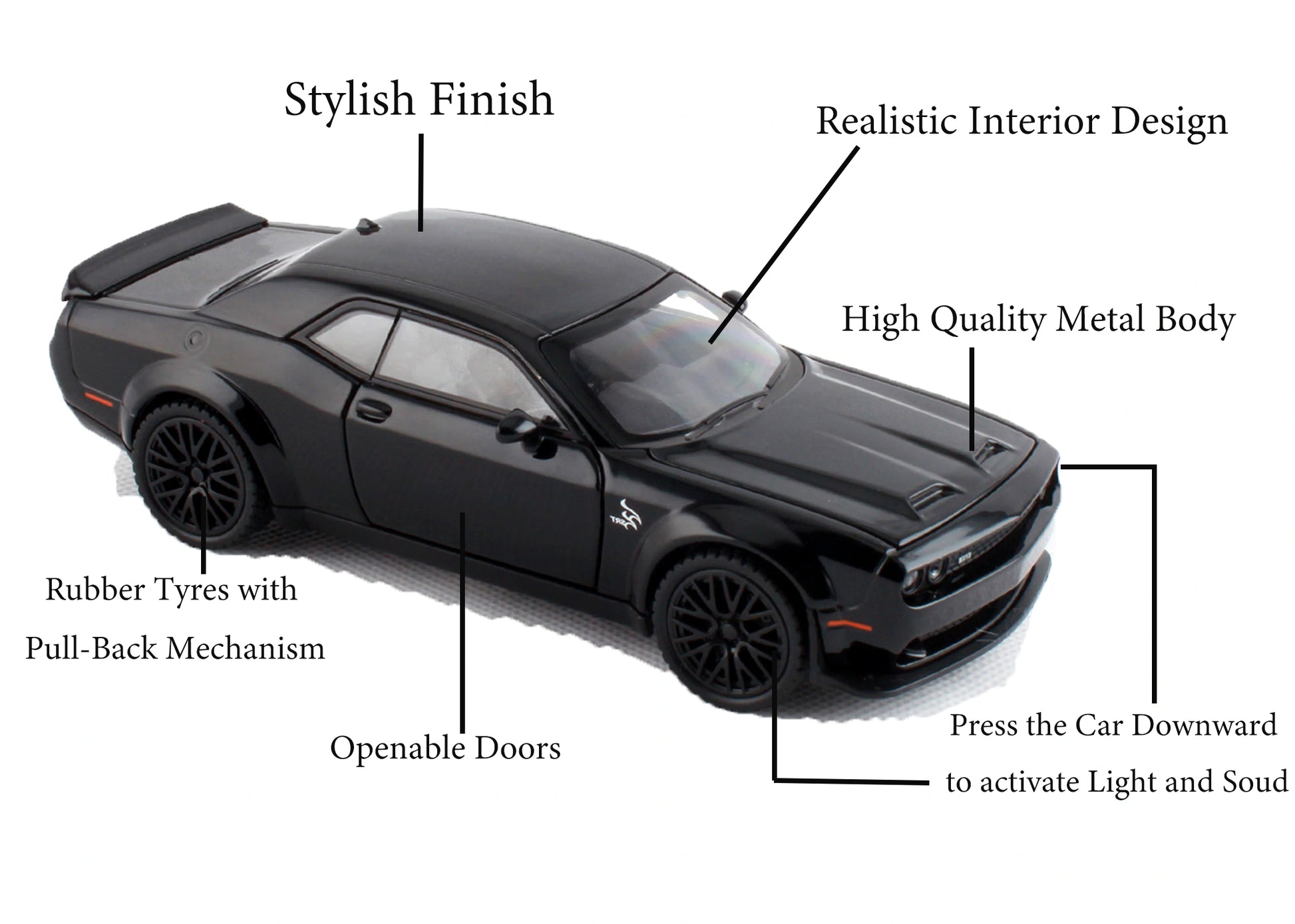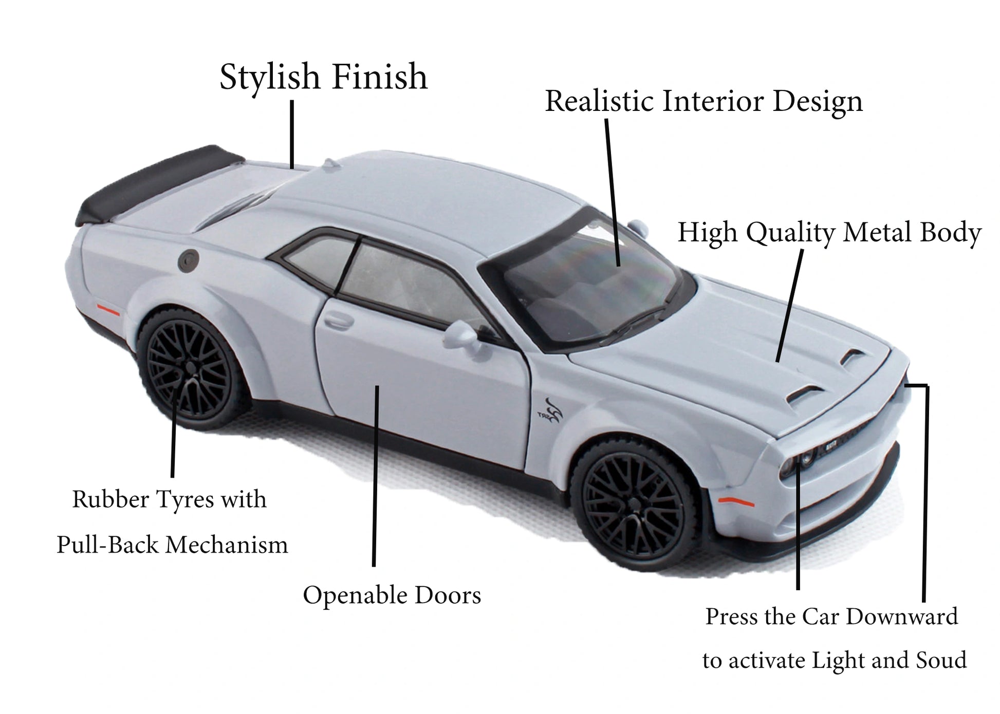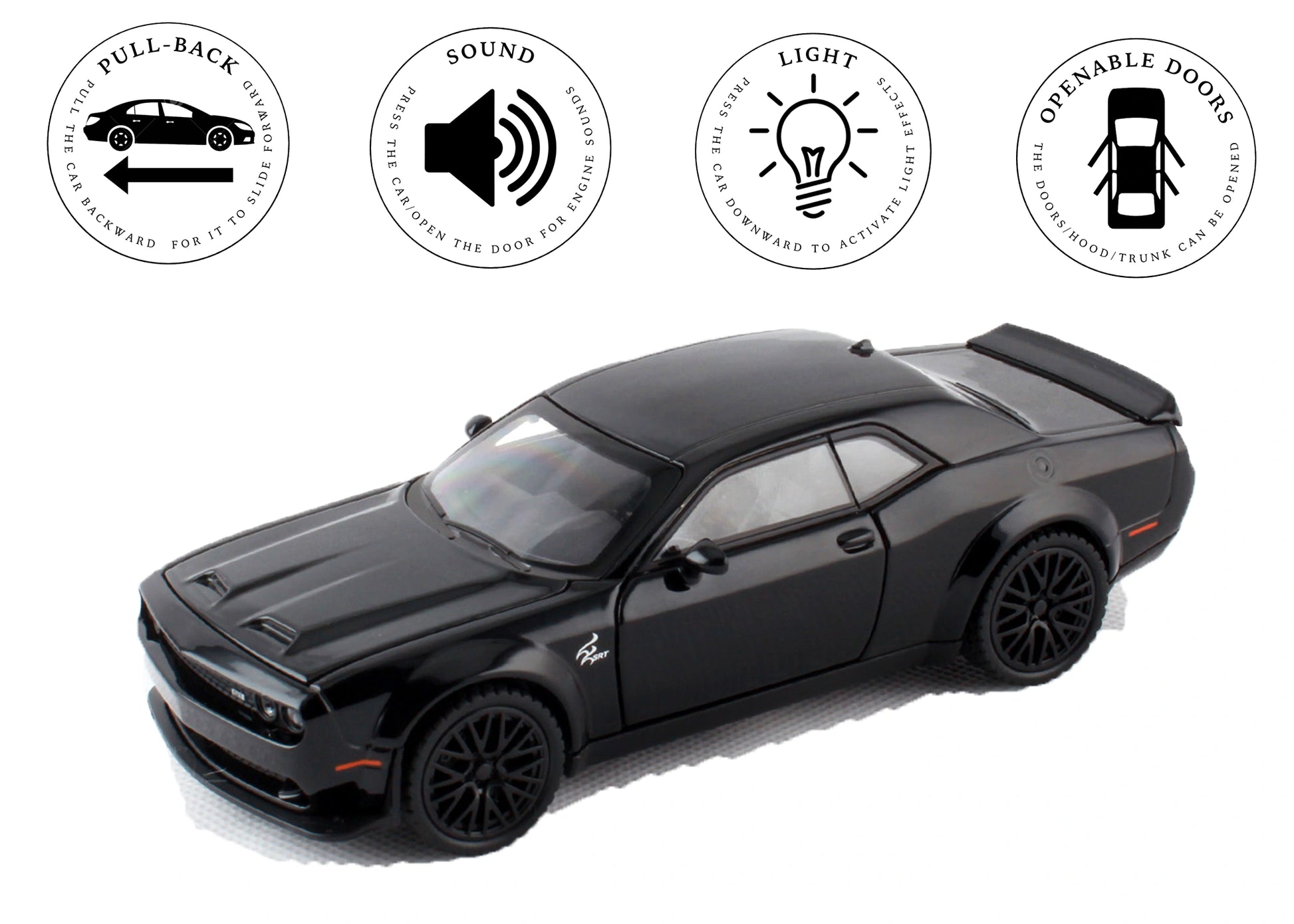 Dodgee Challengerr HellKat 1:32 Scale Diecast Pull Back Toy Car with Openable Doors, Lights & Engine Sound