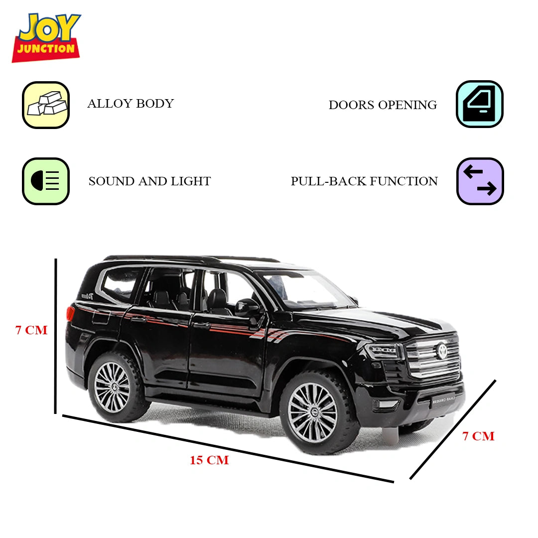 The Land Cruiserr 1:32 Scale Diecast Car is a realistic pull-back toy that combines detailed design with interactive features, making it suitable for both kids and collectors. This model SUV includes working lights, engine sounds, and openable doors, delivering an engaging play experience and display-worthy appeal.