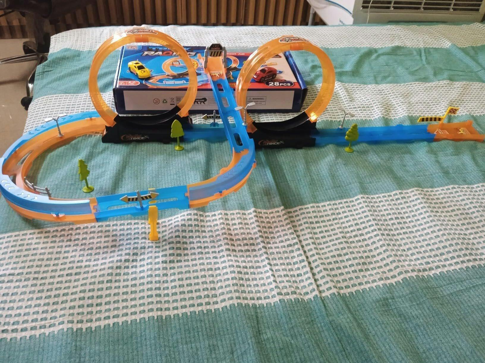 Get ready for high-speed fun with this Race Car Track Set the 28 PCS 360° Spinway Double Loop Super Track Racer Toy for Kids. Packed with exciting ramps, twists, and two giant 360° loops, this car track toy is designed to deliver adrenaline-pumping stunts and endless play.
